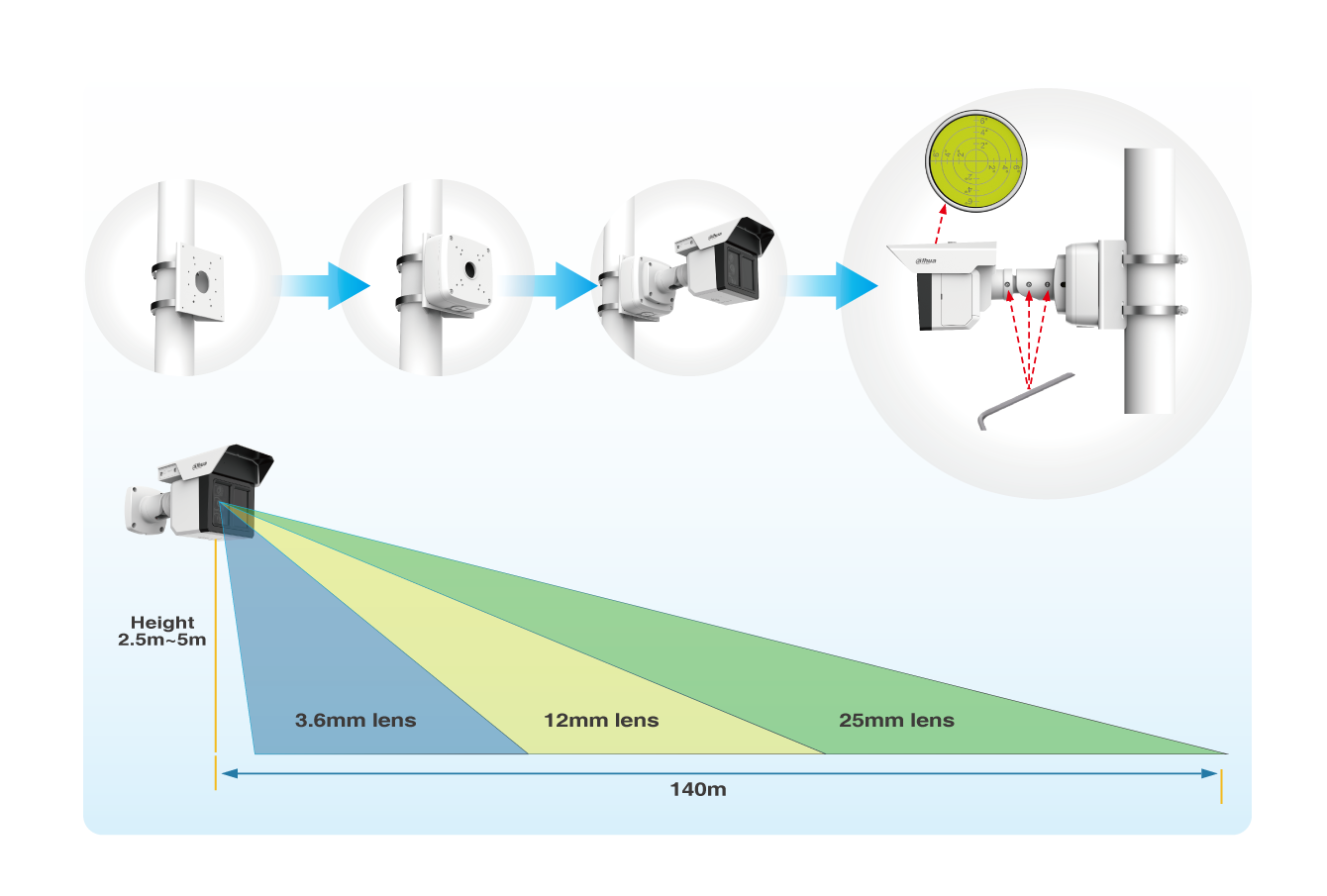Traditional single lens cameras often have limited coverage. Models with short focal lens can not monitor longer distances. Those with long focal lens can monitor far distances, but the blind spot is large. When monitoring long-range scenes, it is often recommended to add at least 3 traditional cameras, incurring high investment cost.