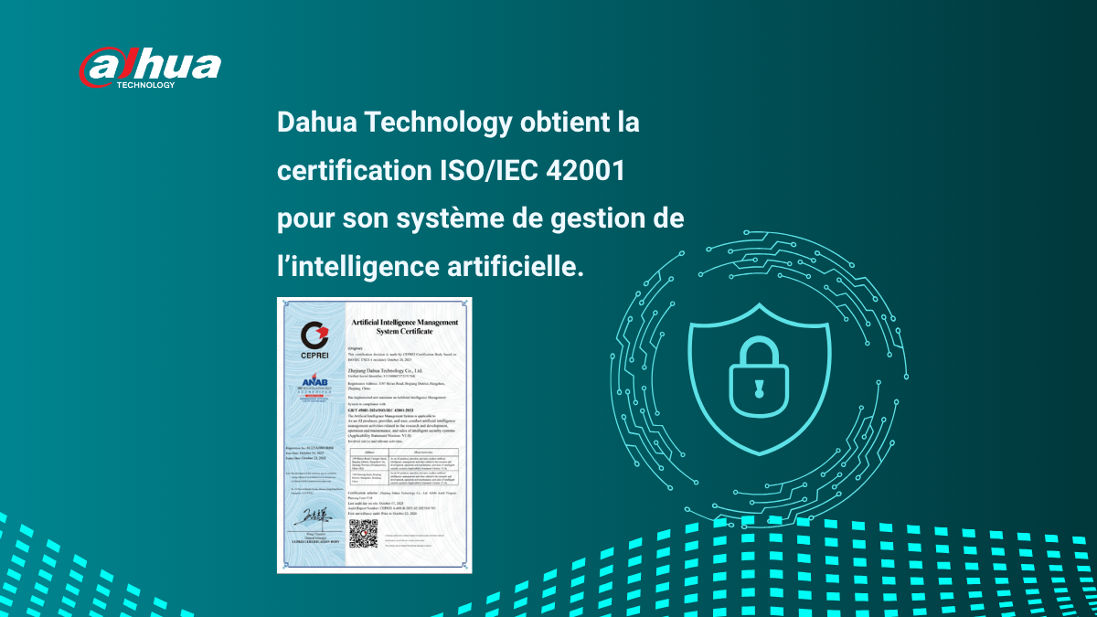 Dahua Technology, un fournisseur mondial de solutions et services AIoT centrés sur la vidéo, est fier d’annoncer que l’entreprise a obtenu, le 24 octobre 2025, la certification ISO/IEC 42001:2023 – “Technologies de l’information – Intelligence artificielle – Systèmes de management”.