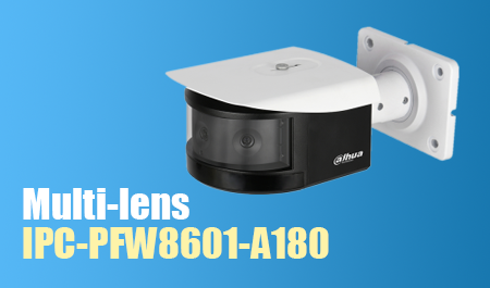 Dahua Multi-lens 180-degree Panoramic Network IR Bullet Camera IPC-PFW8601-A180 provides added flexibility for capturing wide area video surveillance. With real-time image splicing technology, the camera has three 2MP sensors working in tandem to create a comprehensive 180-degree view. This camera replaces multiple single-sensor cameras to lower cost of installation, storage and maintenance.