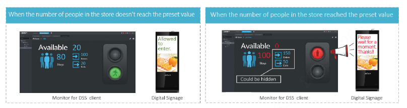 For retailers who require limited customer flow during the pandemic, the Dahua AI-empowered people counting camera can automatically and accurately calculate the real-time number of people entering the store, avoiding congestion and helping to mitigate the spread of the pandemic. When the number of shoppers exceeds the set value, the device will alarm and will display on the digital signage at the entrance of the store that the number of people inside is full, reminding customers to wait at the door. No extra employees are needed to count customers manually at the door, which can help retailers reduce labor costs and improve their management efficiency.