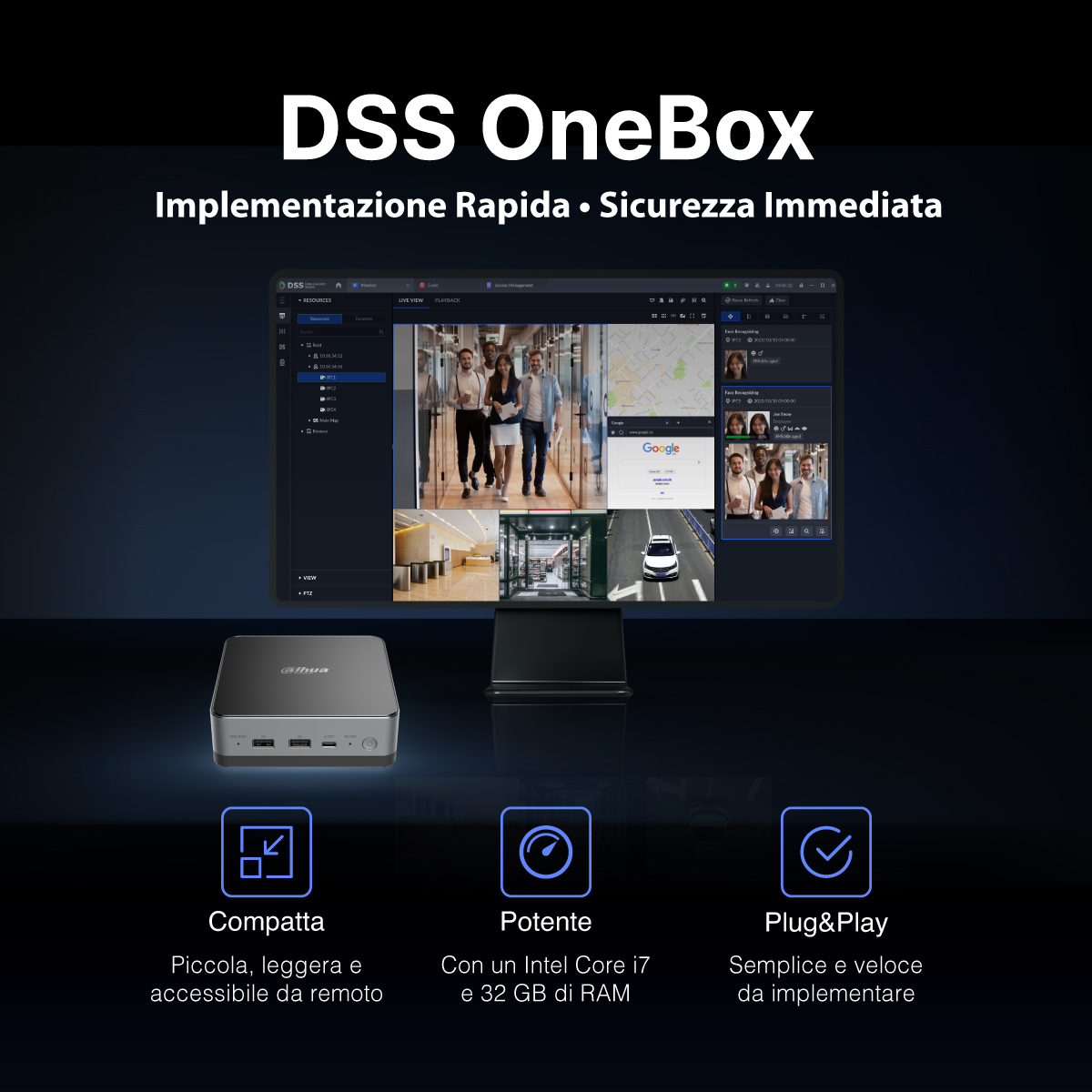 DSS OneBox è la nostra nuova workstation all-in-one dotata di licenza preinstallata, pronta all’uso appena estratta dalla confezione, senza necessità di configurazione o di server aggiuntivi.