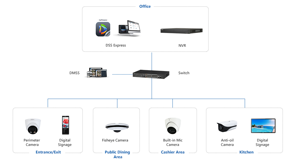 The Dahua SMB Restaurant CCTV Solution is comprised of various types of cameras that cover multiple scenes, such as entrance/exit, kitchen, as well as cashier area. The real-time video of the restaurant is displayed and is viewable remotely through the DMSS app. It provides a safer dining environment.