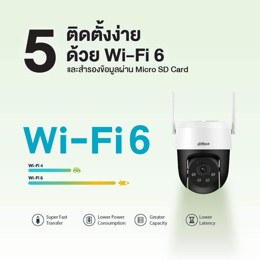 ด้วยการเชื่อมต่อผ่าน Wi-Fi 6 ทำให้การติดตั้งเป็นไปอย่างราบรื่น สัญญาณเสถียร ไม่ต้องเดินสาย LAN ให้ยุ่งยาก และเพื่อความปลอดภัยของข้อมูล ควรใส่ Micro SD Card (รองรับสูงสุด 256GB) เพื่อสำรองไฟล์วิดีโอไว้ ทำให้คุณสามารถย้อนดูเหตุการณ์ต่างๆ ได้แม้ไม่ได้เชื่อมต่ออินเทอร์เน็ต