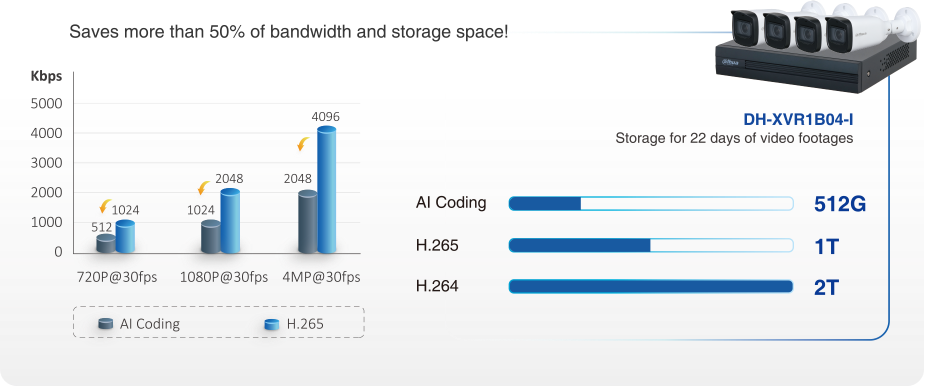 Dahua AI Coding focuses on human and vehicle targets while encoding, ensuring the target's image quality while saving 50% bandwidth and storage costs compared with H.265.