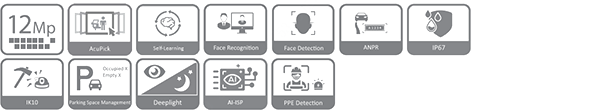 ANPR | ANPR: ANPR, track, priority, snapshot. Vehicle attributes: License plate, vehicle type, vehicle color. Other attributes: Seat belt, smoking, calling. Suppor up to 10,000 blocklist records and 10,000 allowlist records. The camera can recognize plate numbers of vehicles moving at speeds of up to 60km/h. | ||||||||||||||||||||||||||||||||||||||||||||||||||||||||||